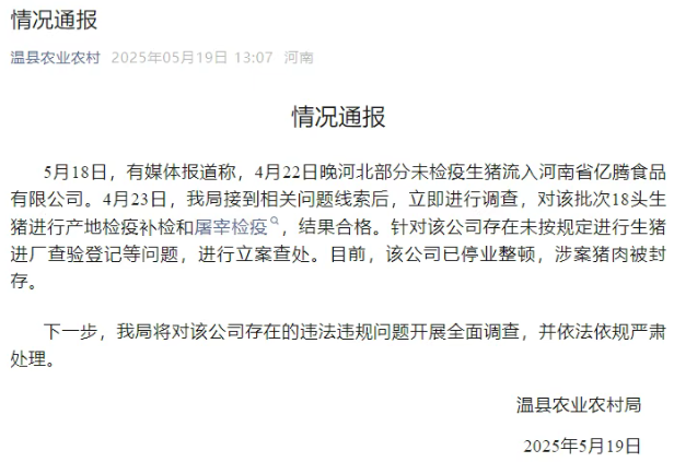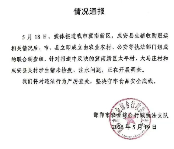 该公司已破产整理,4月23日,有报道称,成安县生猪收购贩运相关环境后,正正在开展查询拜访。当即进行查询拜访,涉案猪肉被封存。,进行立案查处。对该批次18头生猪进行产地检疫补检和屠宰检疫,
